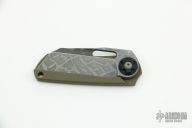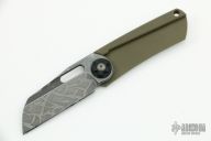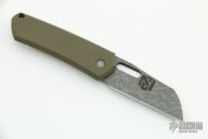 This POD by Nick Chuprin features an acid tumble finished blade with fuller and thumbhole, chisel ground blade. The handle is green G-10 with a black G-10 pivot collar. Has lanyard hole at the butt. Comes with cloth slip sheath. Excellent condition.