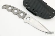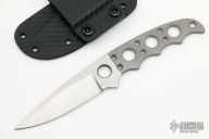 This Undercover Belt & Neck Knife from Pat and Wes Crawford features a satin finished drop point blade with swedge. Notched thumbrest, .147" blade stock and .988" blade depth. Handle has been drilled to reduce weight for ease of carry and is bead blasted. Includes kydex sheath with belt loop and ball chain. This one is marked "Kasper Prototype". Comes with original receipt from Crawford Knives.