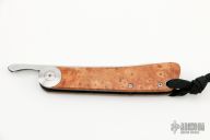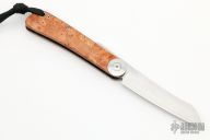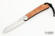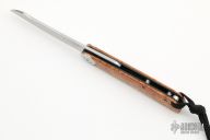 This friction folder by Kansei Matsuno features a hand rub satin finished wharncliffe blade. The handle has wood scales with black liners and a lanyard hole. Comes with a black leather slip sheath. Has some light scratches on the pivot, otherwise excellent condition.