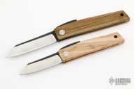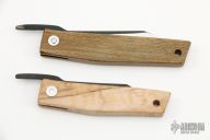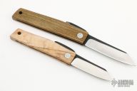 This Pair of Friction Folders by Ohta Knives features a satin finished D2 blade with friction folder style opening and black flats. The handles are maple and Palosanta wood with lanyard holes. Comes with a black leather slip sheaths. Excellent condition.