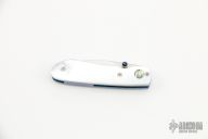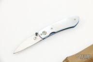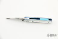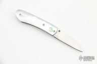 This linerlock folder by William Henry features a hand rub satin finished blade, single thumbstud with abalone inlay. The handle has mother of pearl scales with abalone inlays, anodized titanium liners and backspacer. Comes with brown leather pouch. #15 of 100 etched inside backspacer. Nice detent, lockup and blade seating. Excellent condition. Comes with a William Henry box.