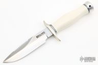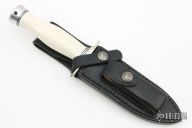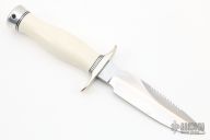 This Combat Companion by Randall Made Knives features a satin finished blade with .209" blade stock and 1.143" blade depth, sharpened top edge and sawteeth, hidden tang construction. The handle is comprised of a nickel silver double guard, black/duralumin spacers, white linen micarta grip, duralumin butt. Includes a black leather sheath. Excellent condition.
