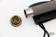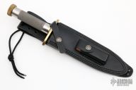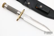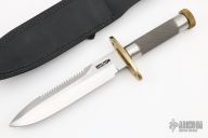 This Model 18-7.5 Attack Survival from Randall Made Knives has a 7.5" blade with sharpened top edge and sawteeth, .219" blade stock and 1.367" blade depth, hidden tang construction. The handle has a brass guard and knurled butt cap, knurled stainless steel handle. Compass in the butt cap. Comes with a black leather sheath. Excellent condition.