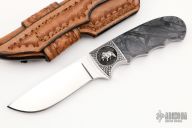 This Engraved Hunter by D'Alton Holder features a mirror polished blade with .197" blade stock and 1.095" blade depth, full tapered tang construction. The handle has high relief engraved stainless steel bolsters by Bruce Shaw, mable scales. Comes with a hand tooled brown leather sheath. Excellent condition.