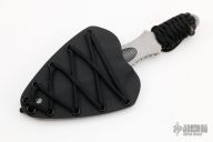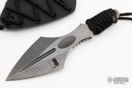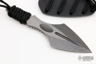 This Apocalypse Spearhead by Angryman Knives features a double edged blade with fullers, thumb and finger grooves, notched tang, .252" blade stock and 2.385" blade depth, full tang construction with paracord wrap. Comes with a kydex sheath. New from maker.