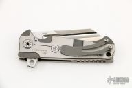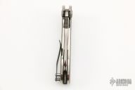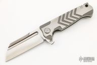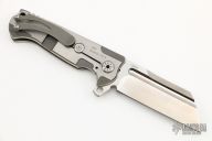 This ADV Mini-Butcher framelock flipper has a satin finished blade with notched flipper and thumbrest. The handle has a two-tone finished titanium frame with polished edges, titanium backspacer with a tip up clip. Has stainless steel lockbar insert and lockbar stabilizer. Nice smooth action, detent, lockup and blade seating. Dated 2014. Comes with a zippered case. Has some light scuffs and scratches, excellent condition otherwise.