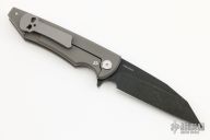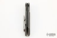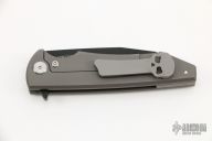 This Sangre Street model has a gray titanium handle with a black canvas micarta inlay. Its blade is made from S35VN steel with a lightly tumbled black finish.