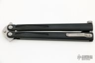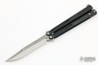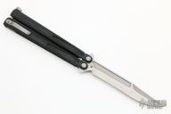 This Tachyon III balisong by Microtech Knives has a stonewash finished blade with false top edge. The handles are integral black aluminum with spring latch and tip up stainless steel clip, bead blasted hardware. Includes original box and papers. Dated 08/2016 and s/n 00135. Has a few light scuffs, otherwise excellent condition.
