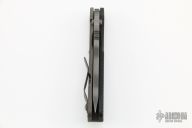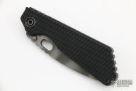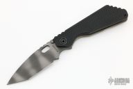 This SNG framelock folder by Mick Strider features a tiger stripe tanto blade and a dimple pattern black aluminum and flamed titanium frame and tip up titanium clip. Includes a "Lock Bar Stabilizer" for maximum reverse lock retention. Nice detent, lockup and blade seating. New condition.