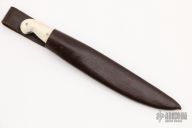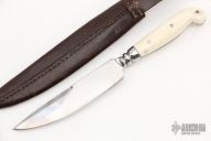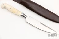 This integral features a mirror polished blade with false top edge, .193" blade stock and 1.112" blade depth, full integral construction with bone scales. Comes with a brown leather sheath. Has a few light scratches, otherwise excellent condition.