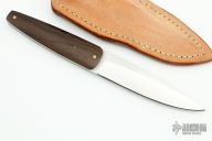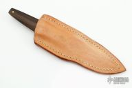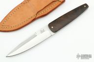 This Boot Knife by Chuck Stapel has a satin finished blade with a false top edge, full tang construction. Blade is .117" thick and .980" deep. The handle has wood scales with brass pins. Comes with a brown leather sheath. Has a few light scratches, otherwise excellent condition.