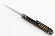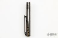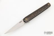 This MS3 Manhattan Special by Michael Zieba features a blasted blade with notched thumbrest and flipper. The handle has a copper/titanium frame with matching tip up clip and anodized titanium hardware, has stainless steel lockface insert, cast brass backspacer with skulls. Rides on bearings, nice detent, lockup and blade seating. Excellent condition. Comes with a zippered case and COA dated 02-26-21.