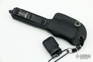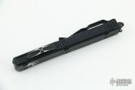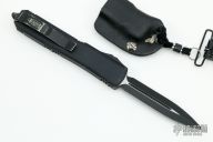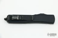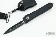 This Ultratech OTF automatic by Microtech Knives features a D/E blade with a standard edge and an all black tactical finish on the blade and handle. Black stainless steel clip. Glass breaker. S/N 86363 and dated 10/2017. Has some scuffs and scratches, has been carried, otherwise good condition. Comes with a custom kydex sheath.