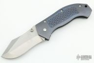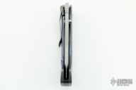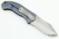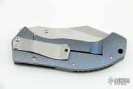 This Mini Ballistic from Jim Burke features a tumbled and bead blasted recurve blade with a false top edge, single thumbstud, and a notched thumb rest. The handle is milled and anodized titanium over a black G10 backspacer. Titanium tip down clip and lanyard hole in pommel. Some minor scuffs on blade, but otherwise great condition.