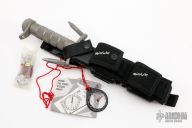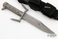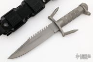 This is an early Buckmaster 184, made prior to full blade being marked with BUCKMASTER and while it was patent pending, hard to find. Has a clip point blade with serrated top edge and saw teeth on spine, .287" blade stock and 1.488" blade depth. The handle has a stainless steel guard, knurled handle and removable butt cap. Comes with original sheath that includes original grappling hooks and lanyard ring. Has some sheath scratches, otherwise excellent condition. Made between November 1984 - July 1985. Comes with original box, survival items and papers.