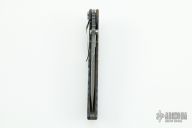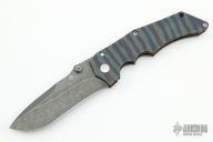 This Villain Framelock from Jim Burke features a dark tumble finished recurve clip point blade with a-symetrical swedge, dual thumb studs and notched thumb ramp. The handle is comprised of flamed titanium over a notched and bead blasted backspacer. Titanium tip down clip and lanyard hole in pommel. Great blade seating, detent and lockup. Excellent condition.