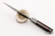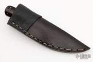 This Caper by Pulliam (please let us know if you know this makers first name) features a Damascus blade with .136" blade stock and 1.137" blade depth, full tang construction. The handle has Damascus bolsters and wood scales. Comes with a brown leather sheath. Excellent condition.