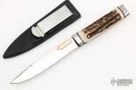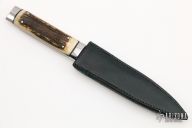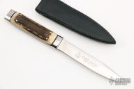 This Handarbeit boot knife by Puma features a mirror polished blade with false top edge, .130" blade stock and .728" blade depth at the ricasso, integral construction. The handle has integral bolsters, front and rear with stag scales. Comes with black leather boot sheath. Comes with original box and papers. #18481 on the tang. Has some oxidation on the blade, otherwise excellent condition.