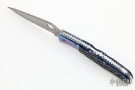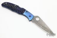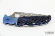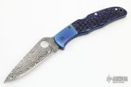 This Endura Lockback Folder has a Damascus VG-10 clip/ spear point blade with thumb hole and notched thumb ramp. Handle is beautiful blue jigged bone with blue anodized titanium bolsters, stainless steel lock/ spacer, and fileworked stainless steel liners. Comes with Spyderco padded zipper case. Has some light scuffs, excellent condition otherwise.