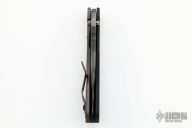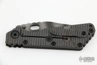 This Mick Strider SMF Bowie framelock folder features a tiger stripe blade with thumbhole and notched thumbrest. The handle has a black aluminum and flamed titanium frame with titanium clip, tip up carry, lockbar stabilizer. Jimping on blade spine. Nice lockup, detent, and blade seating. New condition.
