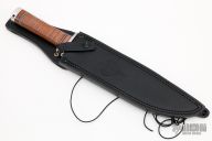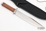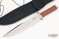 This Tor by Fallkniven features a satin finished VG10 laminated steel blade in convex grind and hidden tang construction. Blade is .273" thick and 1.663" deep. The handle has a stainless steel guard, stacked leather handle with black, red, and white spacers, and an aluminum butt cap. Comes with a black leather sheath with belt loop and a zippered case. Excellent condition. Back of blade reads "TRUST IN GOD - AM"