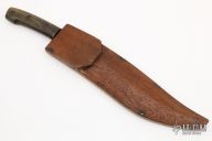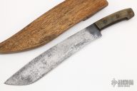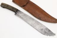 This knife was made in 1982 for a Senior Chief E8 USN (RET.) (1976-1997), after the completion of the JEST School (Jungle Evasion Survival Training School) at NAS Cubi Point, Philippines. The participants of this training school are tracked and hunted in triple - canopy jungle and individually by the Negritos, if they are caught, they fail. This knife was hand forged by his instructor after completing the class. It is forged from a Jeep leaf spring and has caribou horn (Philippine Water Buffalo) handles, the handles are secured with melted lead rivets that are made with whatever lead can be found. It has .215" blade stock and 2.230" blade depth, full tapered tang construction. This knife is very crude and rough, but is the preferred blade of the Philippines. It is used for everything from structure building, tool making, overall survival. This knife comes with a handmade wooden scabbard made of Monkey Pod Wood, made by the same instructor who made the knife. It is carved by hand and then tuned to fit the knife. Has been used, resharpened (sometimes forced to resharpen with unconventional methods in the bush) and carried. This Bolo Knife has quite the story and is very cool and rare, we have only seen one other real one before, and this one is as real as it comes. This one comes with a copy of the Certificate that came along with the completion of JEST.