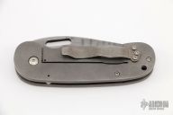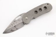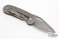 This Bully by EB Custom knives features a 3V blade with hamon and a thumbhole. The handle has a tumble finished titanium frame with a tip up clip. Nice detent and lockup. Has some light scuffs and scratches, otherwise good condition. Comes with a zippered case and a carbon fiber front scale.