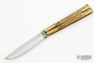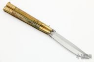 This balisong from the Philippines features a satin finished blade with false top edge. The handle has brass bolsters and channel/liners, jigged bone scales, brass T-latch. Has some scratches and patina, otherwise good condition.