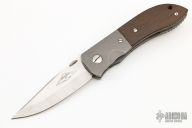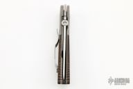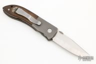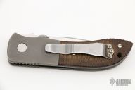 This Custom Emerson MV-4 Viper from Emerson Knives features a satin finished clip point blade with swedge, knurled thumb disc and notched thumb ramp. The handle is comprised of bead blasted and dovetailed titanium bolsters and micarta scales over bead blasted titanium liners and black G10 backspacer. The steel pocket clip is positioned for tip up carry. Lanyard hole in pommel. Nice detent and lockup. Has some scuffs and scratches, some light staining on the blade, has been resharpened, otherwise good condition.