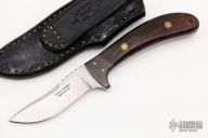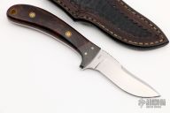 This knife by Alan C Warren features a hand rub satin finished upswept blade with a tapered tang construction, with filework spine, and eight decorative brass inlays.  .148" Blade Stock.  .937" Blade Depth.  The handle features carbon fiber bolsters/guard, red liners and amber ironwood scales.  Includes a brown leather tooled sheath.  Excellent condition.
