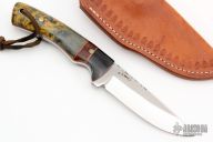 This Hunter by RA Matt features a mirror polished blade with fileworked spine, .157" blade thickness and 1.068" blade depth, full tang construction. The handle has dymondwood bolsters, burl wood scales with brass pins and red liners, red and wood spacers, fileworked tang spine. Comes with a hand tooled brown leather sheath. Has some light scratches, otherwise excellent condition.