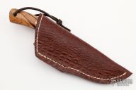 This Hunter by RA Matt features a mirror polished blade with fileworked spine, .158" blade thickness and 1.061" blade depth, full tang construction. The handle has desert ironwood burl bolsters, spalted wood scales with brass pins and red liners, red spacers, fileworked tang spine. Comes with a hand tooled brown leather sheath. Has some light scratches, otherwise excellent condition.