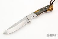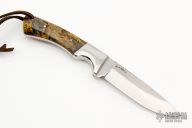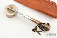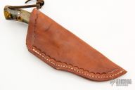 This Hunter by RA Matt features a mirror polished blade with fileworked spine, .155" blade thickness and .954" blade depth, full tang construction. The handle has stainless steel bolsters, burl wood scales with stainless steel pins and red liners. Comes with a hand tooled brown leather sheath. Has some light scratches, otherwise excellent condition.