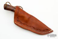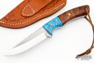 This Hunter by RA Matt features a mirror polished blade with fileworked spine, .155" blade thickness and 1.051" blade depth, full tang construction. The handle has turquoise bolsters, burl wood scales with brass pins and blue liners. Comes with a hand tooled brown leather sheath. Has some light scratches, otherwise excellent condition.