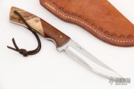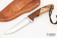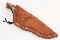 This Hunter by RA Matt features a mirror polished blade with fileworked spine, .155" blade thickness and 1.011" blade depth, full tang construction. The handle has ironwood bolsters, spalted wood scales with brass pins and red liners. Comes with a hand tooled brown leather sheath. Has some light scratches, otherwise excellent condition.