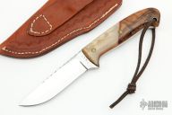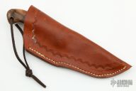 This Hunter by RA Matt features a mirror polished blade with fileworked spine, .155" blade thickness and .970" blade depth, full tang construction. The handle has horn bolsters, burl wood scales with brass pins and red liners. Comes with a hand tooled brown leather sheath. Has some light scratches, otherwise excellent condition.