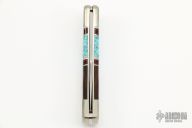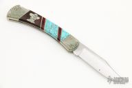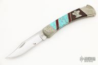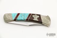 This Buck Model 110 has been customized by Brian Yellowhorse. The blade features a mirror polished clip point blade with a nail nick. The handle features a nickel silver frame with multi piece scales. Includes original display box and COA. Has a couple rust spots on the blade and some patina, otherwise good condition. #200/500