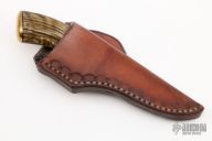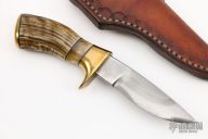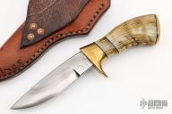 This knife by Chris Amos features a satin finished drop point blade with visible temper line, .209" blade stock and 1.068" blade depth, hidden tang construction. The handle has a brass guard, sheep horn grip and black and sheep horn spacers, brass butt. Comes with a brown leather sheath and a zippered case. Excellent condition.