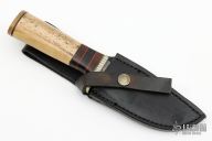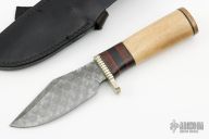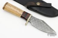 This knife by Macfarlan Knives features a Damascus blade with sharpened top edge and notched thumbrest, .148" blade stock and 1.632" blade depth, hidden tang construction. The handle has a fileworked nickel silver guard, oosic grip with ironwood/red/ebony spacers and a mammoth ivory butt. Comes with a black leather sheath. Excellent condition.