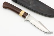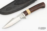 This knife by Gordon Romeis features a satin finished blade with false top edge and notched thumbrest, .186" blade stock and 1.114" blade depth, hidden tang construction. The handle has a stainless steel guard and black desert ironwood grip with ivory paper micarta spacer. Comes with a black leather sheath. Excellent condition.