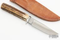 This knife by Gordon Romeis features a satin finished blade with .166" blade stock and 1.005" blade depth, hidden tang construction. The handle has a stainless steel guard and stag grip. Comes with a brown leather sheath. Excellent condition.