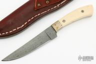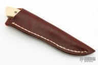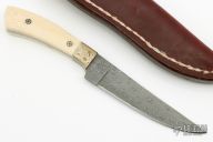 This fixed blade from Phillip M. Parris features a Rob Thomas raindrop pattern damascus blade with .158" blade stock and 1.209" blade depth, full tang construction. The handle has dovetailed 3-alloy mokume, walrus ivory scales with mosaic pins. Comes with a brown leather sheath. Excellent condition.