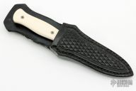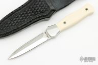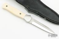 This EDC Dagger features a two-tone double hollow ground blade with mirror polished grinds and satin flats, mirror polished stainless steel dovetailed bolsters and mammoth ivory scales with mosaic pins, .157" blade stock and .786" blade depth, full tapered tang construction. Very nice work. Comes with a hand tooled black leather sheath. Has a couple of very light scratches, otherwise excellent condition.