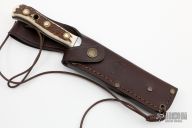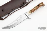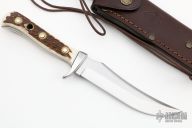 This skinner features a satin finished upswept blade with false top edge and a full tang construction. .151" Blade stock.  1.121" Blade Depth.  The handle has an aluminum guard and stag scales with brass rivets. Includes a brown leather sheath, box and papers. Excellent Condition.