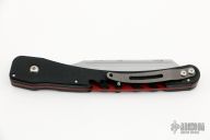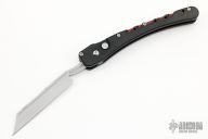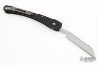 This Hell Razor side opening automatic by Rob Dalton features a bead blasted straight razor blade. The handle has a black G-10 frame with an anodized titanium tip up pocket clip. This one has been modified slightly, the sawteeth on the spine of the blade were ground off and the handle has been shaped down on the spine. Good condition otherwise. Comes with a zippered case.