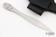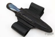 This Sleeve Dagger by Kelly Carlson features a mirror polished chisel ground double edged blade with satin finished flats, .165" blade stock and .725" blade depth, full tang construction with a blued mosaic Damascus scale on one side. The scale is attached from the back side with three fileworked screws. Comes with a black leather sheath that could be attached to your arm or leg. Has a few light scratches, otherwise excellent condition.