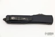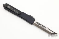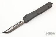 This Ultratech Hellhound Tanto by Microtech features a two-tone blade with tumbled DLC finished grinds with satin finished flats, notched thumbrest and a nearly sharpened top edge. The handle is black aluminum with black finished hardware and clip, has a carbon fiber top. Excellent condition. Dated 09/2019.