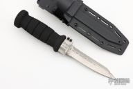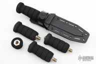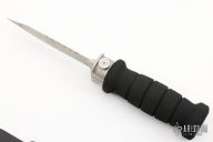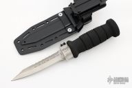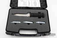 This Wasp scuba knife features a clip point blade with serrated spine, 1/4" blade stock and 1" blade depth, hidden tang construction. The blade has a gas injection system. The handle has a titanium guard with push button for CO2 release, and removable rubber handle where the CO2 cartridge is installed. Comes with original box, and papers. Comes with a kydex sheath. Comes with extra one time use handles. Excellent condition.