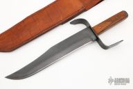 This Bowie by Ron Jamieson features a black tumble finished blade with visible hamon, .243" blade stock and 1.973" blade depth, full tang construction. The handle has a black steel guard with hickory wood scales and steel butt. Comes with a brown leather sheath. Has a few light scuffs/scratches, otherwise excellent condition.
