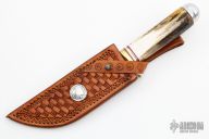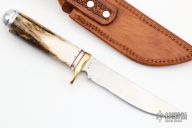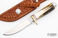 This Hunter by Ron Jamieson features a satin finished blade with .125" blade stock and .990" blade depth, hidden tang construction. The handle has a brass guard, stag grip, aluminum butt, red/copper/fluted aluminum spacers. Comes with a hand tooled brown leather sheath. Excellent condition.  #585